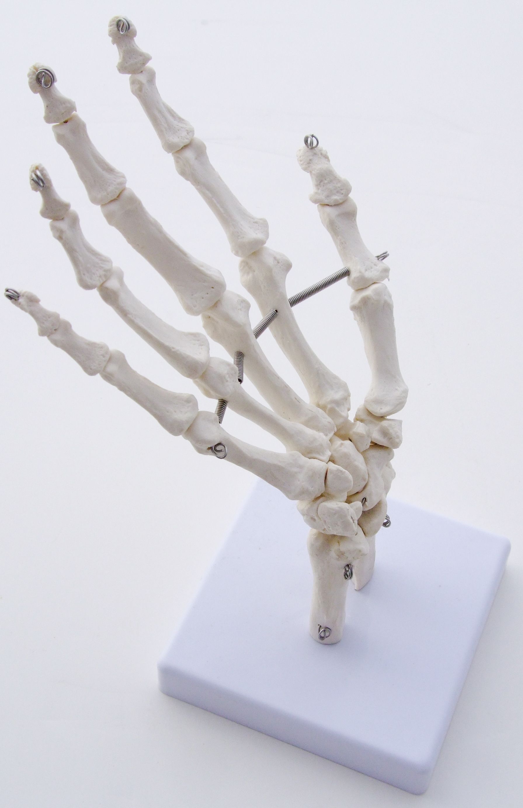 Our life-sized model skeleton of the hand is mounted on a stand with base. Joints are articulated. Made of high quality PVC plastic.