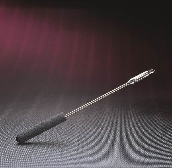The Neon Wand is a glass tube filled with neon gas and fitted with conventional neon sign electrodes at either end. It is used for demonstration purposes with a Van de Graaff Electrostatic Generator to show that enough current can be conducted through the air and the body of a person to light the tube.